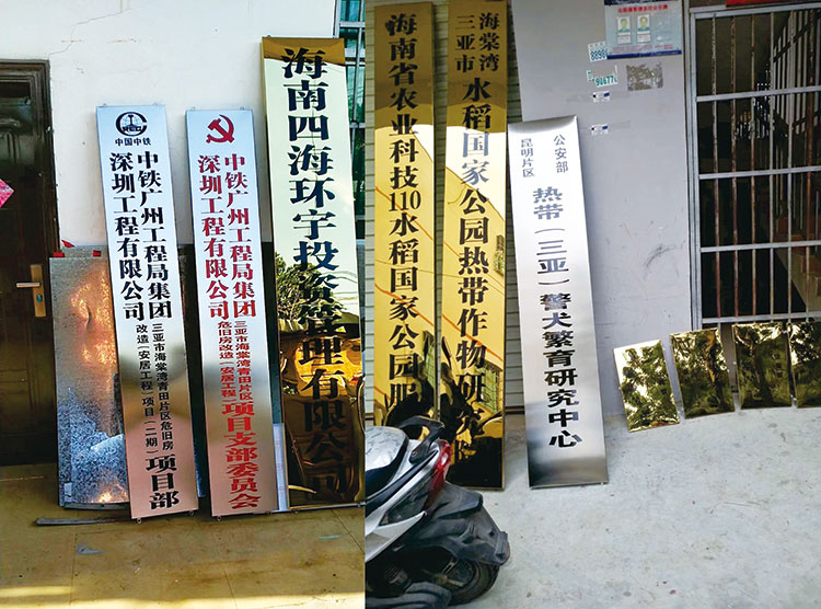 不锈钢腐蚀牌,是以不锈钢为材料,通过腐蚀雕、抛光、打磨等工艺制作而成的广告指示牌。多用0.6mm厚不锈钢板,面板腐蚀凹凸,填充箱应用最多。